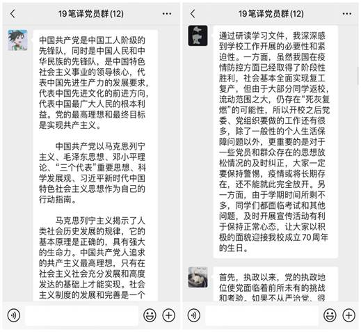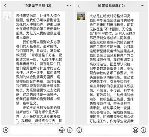 5月25日,2019级笔译党支部在线上召开5月份主题党日活动。本次会议由支部书记刘苏萌主持,支部同志悉数参加。会议的主要内容有:重点学习中央关于疫情防控工作的最新部署,《中共重庆市委教育工作委员会办公室 关于印发 2020 年组织干部工作要点的通知》;传达学习四川外国语大学 2020 年全面从严治党和思想政治工作会议精神;深入学习《习近平谈治国理政》第一卷第五、六、七、八章,《中国共产党章程》第一章、第二章等内容。