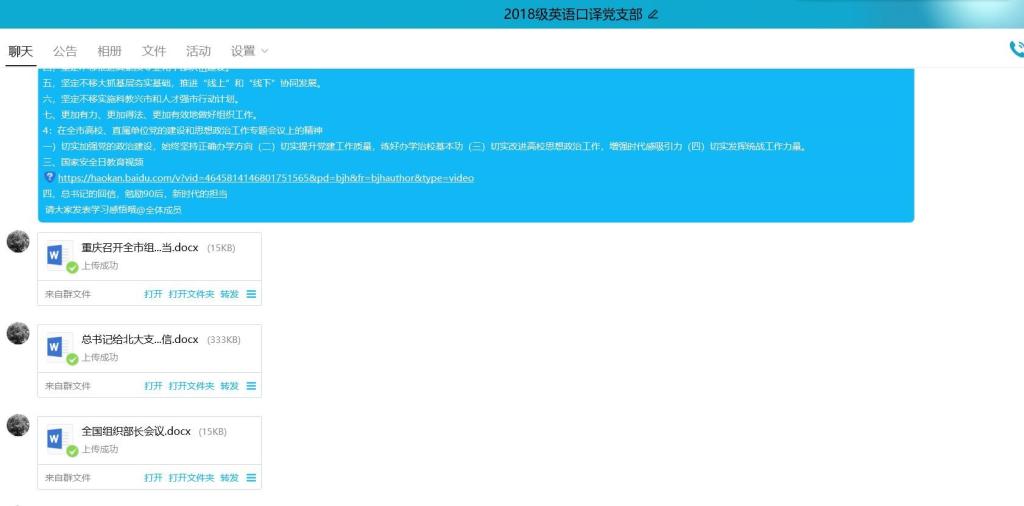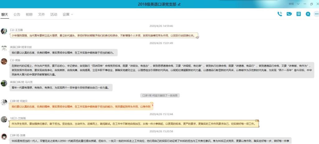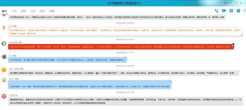 为深入学习贯彻习近平总书记关于疫情防控工作的重要讲话和指示批示精神,落实中央、市委以及学校党委、太阳成集团tyc33455党总支相关部署要求,巩固深化“不忘初心、牢记使命”主题教育成果,4月26日下午太阳成集团tyc334552018级MTI英语口译党支部全体成员在支部QQ群开展了网上党日活动,支部全体成员参与。