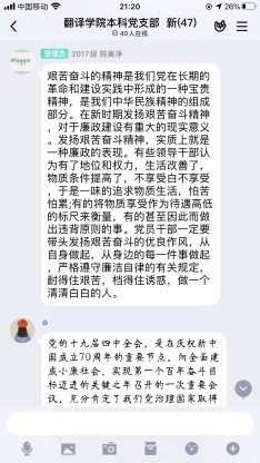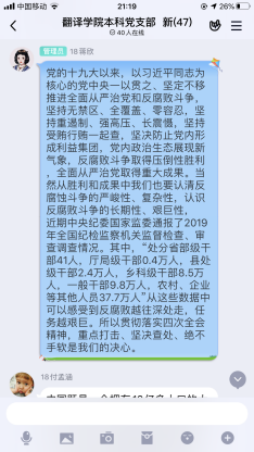 本次活动中,马洪洲同志通过社交平台引导党员们自学,通过观看专题学习视频、研读相关讲话精神等方式,重点学习了“十九届中央纪委四次全会精神情况”、“市委五届八次全会情况”、“十九届四中全会精神专题学习视频”、“习近平给复旦大学《共产党宣言》展示馆党员志愿服务队全体队员的回信”等内容。