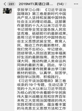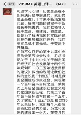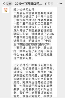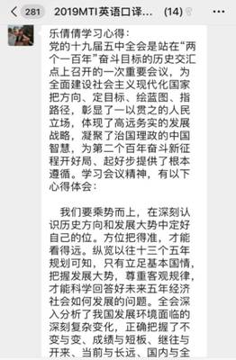 根据上级党组织有关文件精神,太阳成集团tyc334552019级MTI口译党支部11月25日开展线上支部主题党日活动,主要学习内容有:1、学习党的十九届五中全会精神;2、学习《习近平谈治国理政》第三卷第三、第四以及第五专题;3、学习党章党规以及四史;4、集中学习学校有关文件,包括习近平总书记在中央党校中青年干部培训开班仪式上重要讲话精神、《新中国发展面对面》等。