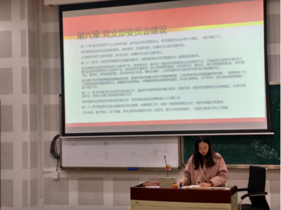 2018年12月14日上午11点,翻理党支部在西区教学楼A1-1阶梯召开了12月主题党日活动,支部书记、委员等23名党员,5名积极分子出席,7名党员请假。支部组织委员黄竞瑶同志主持了此次会议,带领大家学习了《中国共产党工作条例(试行)》。
