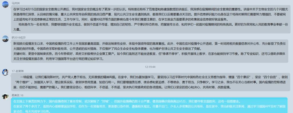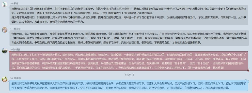 最后,马洪洲同志对本月党日活动进行总结。他表示通过学习以上几个内容,了解到了相关精神的本质内涵,深入认识到作为一个合格的党员同志应该背负着什么样的责任。另外,他强调疫情期间的安全教育和提升信息辨识能力的重要性。同时,他提醒各位学生党员要注意疫情对经济等方面影响,做好就业准备。最后,他告诫各位学生党员要保持学习,努力充实自己,随时准备好为国家贡献自己的力量。