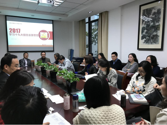唐昉老师首先带领全体教师全文学习了习近平总书记代表中央委员会所作的报告。报告中指出了习近平新时代中国特色社会主义思想的八个明确,七个战略,四个重要判断,两个阶段等重要内容。接着,唐昉老师还结合学院教师的专业教学,向大家介绍了目前学院与环球网合作进行的中国关键词项目,全面深化改革中英文版的相关专业语言学习等活动,她表示:教工支部在工作中要努力做到“围绕教学抓党建,抓好党建促发展”,通过党建加强基层组织的建设,夯实基础,努力提高自身的思想觉悟和专业水平,为学院的发展献言献策。