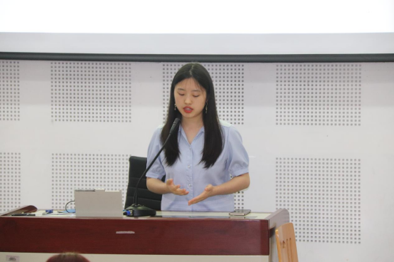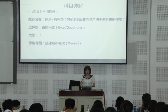 第三位进行分享的是被广东外语外贸大学英语笔译专业录取的黄梓晴。她以备考广外为例,和同学们分享了自己在专业课及公共课学习方面的心得以及“背诵笔记、结合教材、拓展知识、考前模拟”的学习经验。