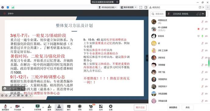 第一期“研”途取经在同学们中取得强烈反响,同学们纷纷表示通过学长学姐们分享的学习心得和备考历程,熟悉了备考流程和技巧,进一步明确了学习目标和方向。在此基础上,6月19日晚,我们通过腾讯会议举行了第二期考研经验分享。 跨考上海大学文学院历史学的张俊成、考取南开大学英语口译专业的王金聪,以及考取格拉斯哥大学教育研究专业的邓怡雯,分享了他们的学习备考经验经验。让我们跟随这三位同学,“译”路前行吧!