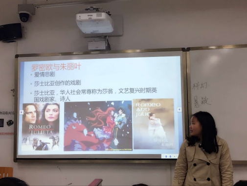 戏剧组选择的是众人都比较熟悉的爱情悲剧――《罗密欧与朱丽叶》。主讲人徐幸幸首先对戏剧的含义与类型做了个大概介绍,然后讲述了该剧发生的时代背景和主要内容,并引用了几位文学巨匠对《罗密欧与朱丽叶》的剖析,和大家一起探讨了巨匠们的观点。最后,该组展示了组员为该电影的经典桥段录制的一小段配音,获得了大家的称赞。