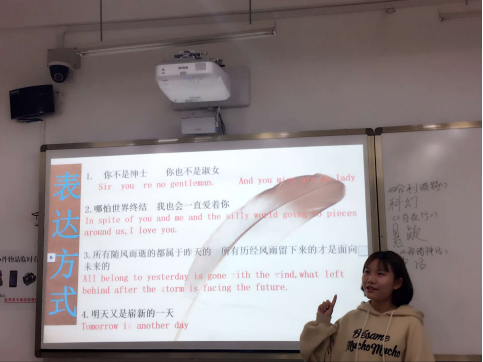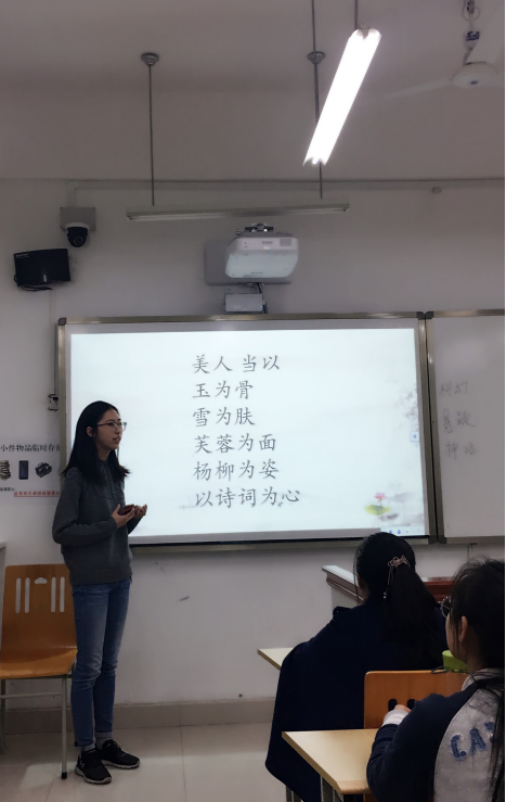 诗歌组选择分享的内容是中国古诗词。江星贝首先上台,介绍了小组的主题并解释选择中国古诗词作为分享对象的原因。接着,杨莉鸽和黄晓柯相继上台从诗词的创作背景、内容、情感表达等方面详细地介绍了苏轼的《水调歌头》和陆游的《钗头凤》,还和同学们一起朗读了两首诗词。最后,江星贝将两首诗词的英文译版与原版进行对比,分析了在翻译诗歌时需要注意韵脚、字数、对称等问题。