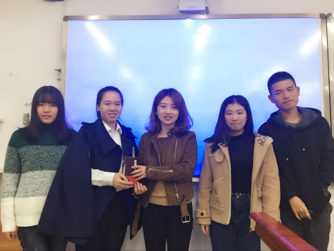 各组同学分享完后,辅导员姚沁老师也给大家推荐了一本社科类的书籍:《人类简史》,并鼓励大家在课余时间多读书,读好书,在不断充实自己的过程中度过自己的大学时光。读书会上大家还投票选出了本次读书会活动一、二、三等奖。科幻组以五票的绝对优势获得一等奖,诗歌组、名著组和戏剧组获得二等奖,神话组和悬疑组获得三等奖。最后,辅导员为各小组颁发了奖品。本次读书会活动在颁奖和合照的欢声笑语中圆满落幕。
