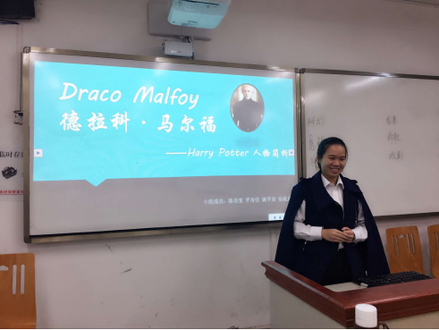 科幻组分享了一个关于魔法学院的故事――《哈利波特》。主讲人陈语斐分享的内容重点突出,详略得当,以书中的一个人物串起了整个故事。科幻小组以贵族、承担、挣扎、选择四个点着手,非常有条理地讲述了德拉科是如何从一个幼稚的小男孩成长为一位能够承担家庭责任与使命的男人。该小组通过展示原著中对德拉科的描写片段和电影合集,让德拉科的形象更加鲜明、立体。