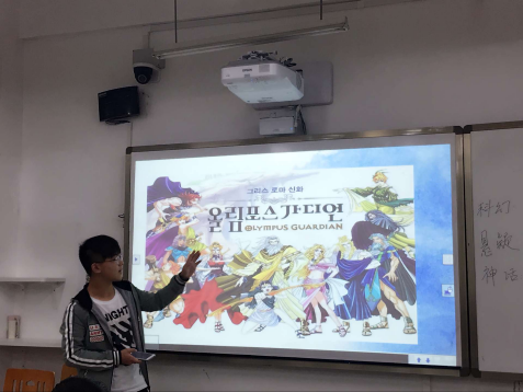 神话小组选择分享的书本是《古希腊神话故事》。主讲人胡敏行首先为同学们大概讲了12诸神的名字以及各自的象征含义和人物间的关系。通过这个板块,同学们对希腊神话故事中的人物有了些基本了解。接着,胡敏行详细地介绍了三个人物,并且声情并茂地朗读了一小段原著。最后,神话组分享了几个希腊神话故事,非常引人入胜。