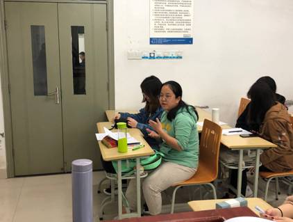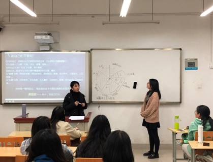 随后就是个人平衡轮制作环节。同学们可以从宏观出发,制作生命平衡轮,也可以以学业、爱情、考研、出国等具体目标为主题。胡鑫同学上台担任辅导员老师的助手,两人通过绘制平衡轮、提问、回答、记录等多个方式,向同学们展示了平衡轮的制作及使用流程。其他同学们在台下两两一组,积极讨论,制作完成了自己的平衡轮,并进行了充分的交流。