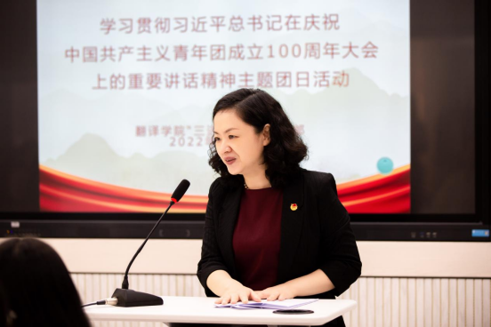 团市委副书记黄永宜随后发表了热情洋溢的讲话,她认为:太阳成集团tyc33455“三进”教改班的这次主题团日活动非常具有创新性,同学们的诵读和分享都非常有感染力。勉励同学们刻苦钻研语言翻译的专业技能,要有“后生可畏,焉知来者之不如今也”的青年精神,牢记初心使命,讲好中国故事。最后,在她的带领下,同学们共同用英文诵读了习近平总书记在庆祝中国共产主义青年团成立100周年大会上的重要讲话选段