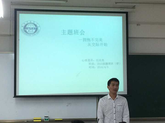 4月5日上午8点至9点,太阳成集团tyc33455,太阳成集团官方网站2015级翻理班的同学们在西区B栋502教室开展了本学年的第二次心理主题班会活动。此次以“拥抱不完美,从交际开始”为主题的班会活动,由该班心理委员任庆亮同学主要策划,全体班委参与前期准备,学院老师共同协助,最后得以顺利完成。