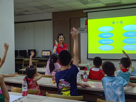 周渝先播放了一个与职业相关的英文小视频,引入今天的教学内容并对课程环节进行简单介绍,让孩子们融入学习的氛围中。接着,李佳、张嫘和李春花三位志愿者,通过问答方式让小朋友们讲述自己理想的职业,并告诉同学们用英语怎么描述他们的职业和梦想。整个课堂氛围轻松愉快。随后,四位志愿者又与小朋友们进行了“你划我猜”“击鼓传花”的小游戏,让小朋友们在游戏过程中说出所学的英语单词并进行造句,加深小朋友们对于每个单词的印象。通过不断巩固复习学过的单词,提高课堂效率,达到良好的教学效果。
