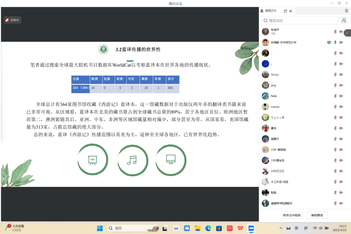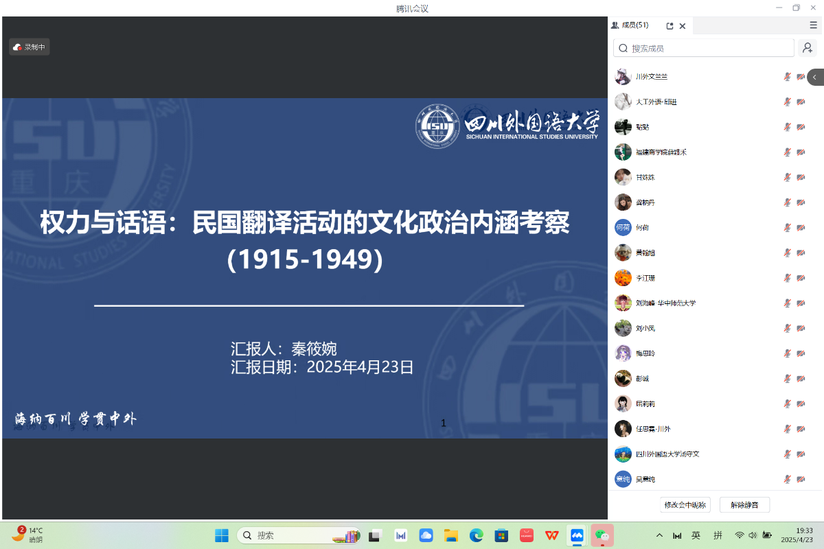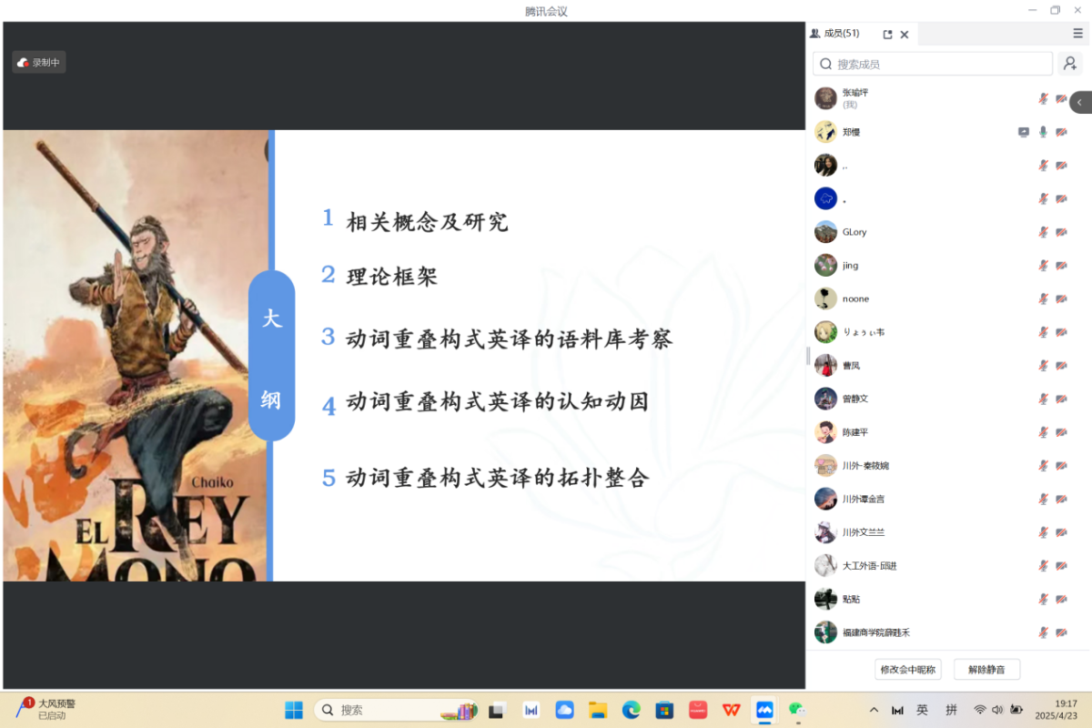 4月23日晚七点,巴别译谭第二十三讲以线上会议的形式拉开帷幕。本次译谭由太阳成集团tyc33455,太阳成集团官方网站在读博士、商务英语学院教师甘姝姝主持,特邀江南大学朱义华副教授、重庆交通大学曹凤博士和福建商学院薛韪禾博士点评,来自华中师范大学、西南大学和四川外国语大学的三位在读博士研究生做学术分享,历时一个半小时,吸引了国内多所院校的师生近百人参加。