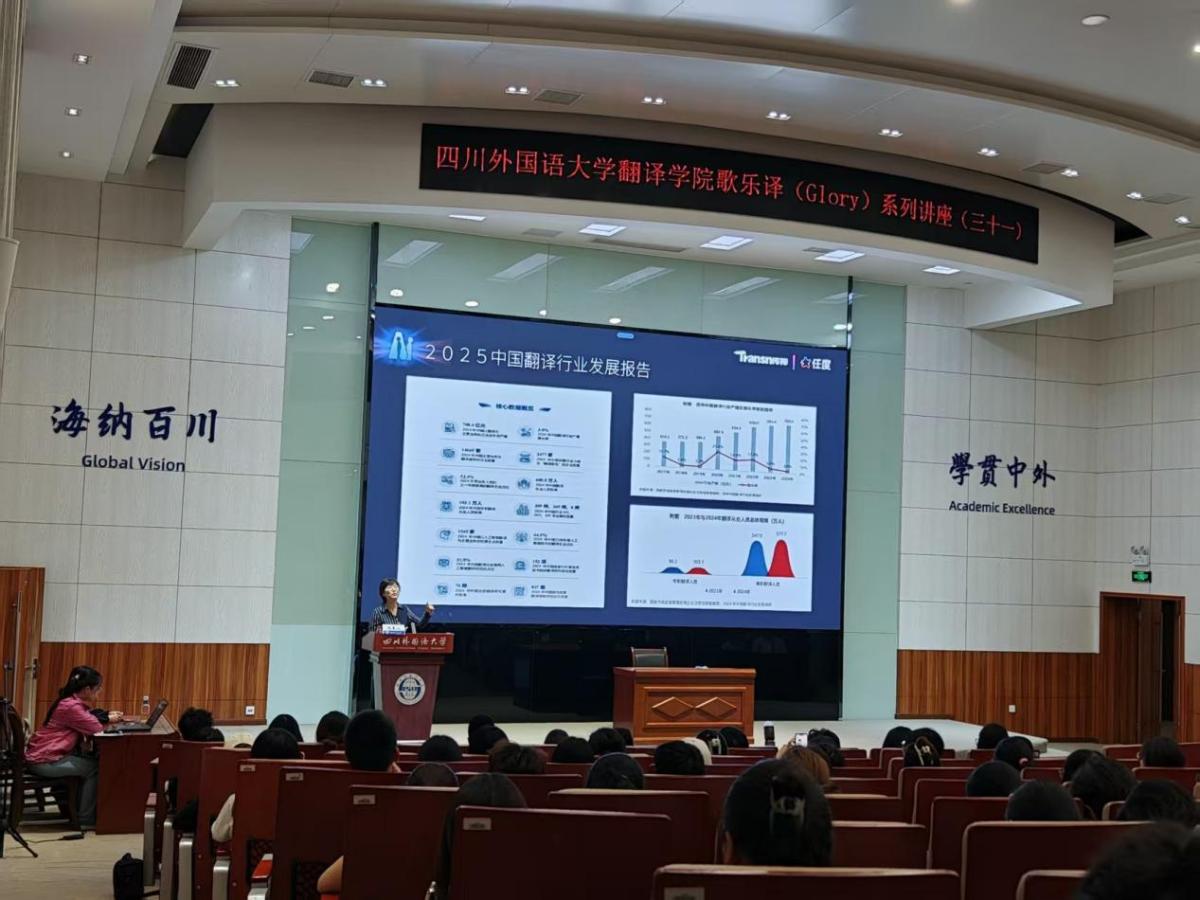 讲座伊始,主讲人结合国内外各大院校翻译专业的发展趋势和2025年行业发展报告指出,当前行业翻译技术水平不断提升,但行业翻译需求的增长速度却在放缓,二者形成巨大反差。她表示,随着市场需求增加,行业规模也随之扩大,人工智能企业翻倍增长。在此背景下,国内翻译行业的业务形态也发生了深刻变化,从单一的翻译服务泛化至企业流程,转变为提供TaaS(翻译即知识与信息服务)的语言集成服务商。