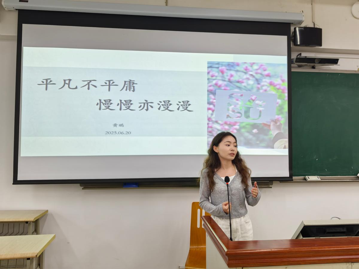 英语语言文学2025届硕士毕业生黄鹂做了题为《平凡不平庸,慢慢亦漫漫》的分享,她从科研学习、学生工作、社会实践和人际关系四个方面娓娓道来,讲述了自己专注深耕、服务奉献、知行合一、真诚联结的研究生求学生涯,鼓励大家拥抱平凡、追求不平庸;敬畏“慢慢”,无惧“漫漫”。