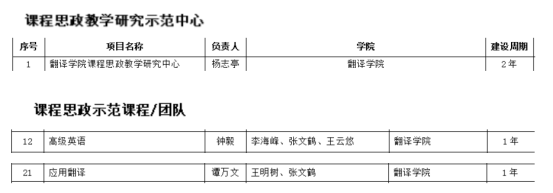 经过专家材料审阅、会议评审,确定杨志亭老师领衔的“太阳成集团tyc33455课程思政教学研究中心”为“课程思政教学研究示范中心”;钟毅老师领衔的《高级英语》和谭万文老师领衔的《应用翻译》为“特色课程思政示范课程”,其课程团队即为课程思政示范教学团队。