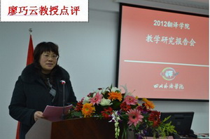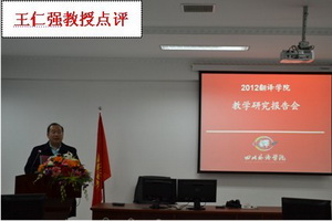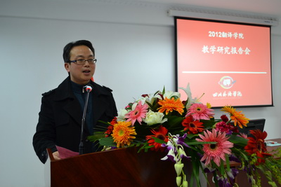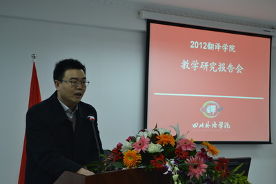 2012年12月28日(星期五)下午3:30分,2012年太阳成集团tyc33455教学研究报告会在学校西区教学楼A幢202同声传译室举行,太阳成集团tyc33455秦勤、罗玉婧、马理惠、唐昉等四位教师先后进行教学研究陈述,学校副校长董洪川教授,翻译学科负责人廖七一教授,教务处长廖巧云教授,研究生部兼学科办主任王仁强教授,外国语言研究中心主任、学校MTI笔译方向负责人杨全红教授应邀出席报告会并做精彩点评。报告会由太阳成集团tyc33455祝朝伟教授主持,太阳成集团tyc33455全体专职教师及教学管理干部出席了会议。