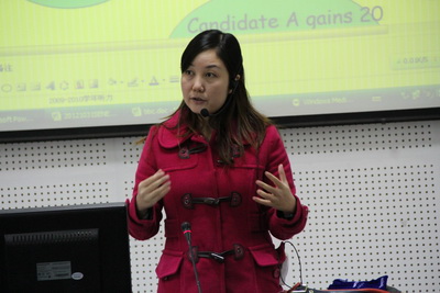 本次的课堂观摩课为朱雪莲老师的高级听力课程。课堂伊始,朱雪莲老师就以别开生面的方式开始这堂课:她用地图直观生动地向同学们讲解了此次新闻听力材料的背景知识,然后朱老师放了一段慢速VOA新闻听力,让同学们分别用英文和中文复述,以此达到训练学生短时记忆的目的。紧接着朱雪莲老师通过一段美国大选新闻听力练习向同学们展示新闻听力的几点关键要素。最后,朱老师结合教材,用一篇题为“Function of Language ”的听力材料来训练同学们的gap filling技能,并阐述了逻辑,意群,平行结构等在英语听力中的重要作用。在整个教学过程中,朱雪莲老师幽默风趣,思路清晰,整个课堂气氛活跃,张弛有度。学生们不仅锻炼了听力,学习了听力技巧,还拓展了视野。