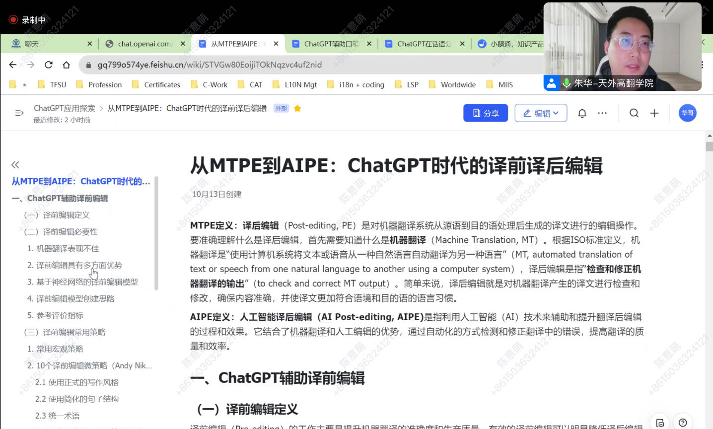 在ChatGPT辅助译后编辑上,朱老师对译后编辑的定义等基本内容进行简要介绍,展示了常见的机器辅助软件,借用实例分析了译后编辑的常用策略。