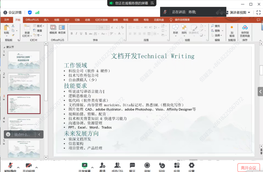 陈艳首先结合工作中的实例介绍了作为技术写作的“文档开发”岗位的工作内容、技能要求,随后,介绍了翻译专业学生进入技术写作行业需要具备的能力、优势与不足,以及该行业的职业发展方向,分享了翻译专业的学生如何将课堂上学到的理论知识与专业技能转化成高效的实践能力,顺利走向职场的经验。此外,陈老师还介绍了翻译专业可能的就业方向,为翻译专业学生提供了切实的学习专业技能与提高就业机会的建议。