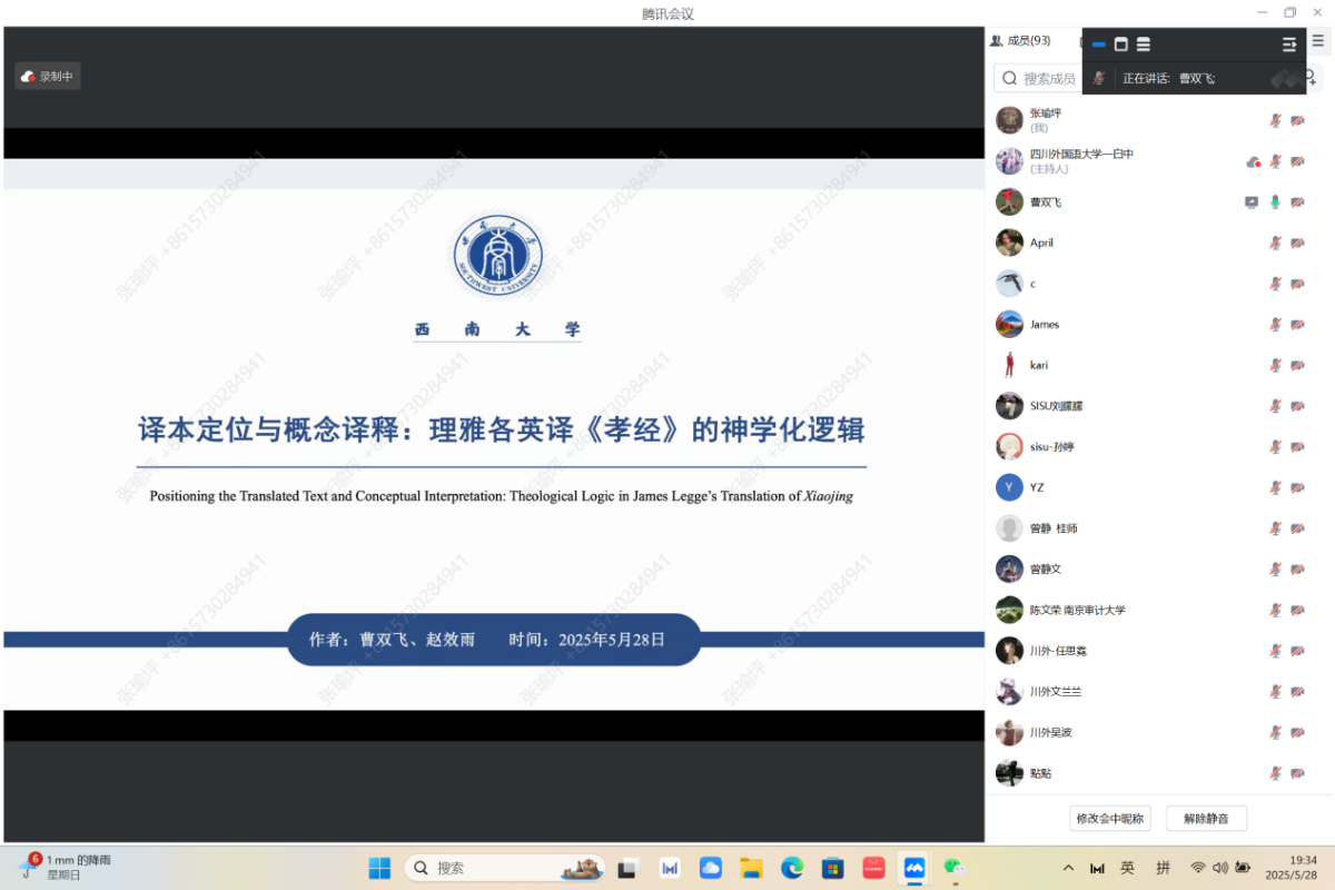 三位博士生依次做学术分享。首先是何丹妮博士带来的《政治文献中术语“文明”英译的历时研究》主题汇报。第二位是曹双飞博士发言,汇报题目是《译本定位与概念译释:理雅各英译<孝经>的神学化逻辑》。第三位是李江珊博士就《葛瑞汉英译李贺诗歌的审美构形》进行主题汇报。
