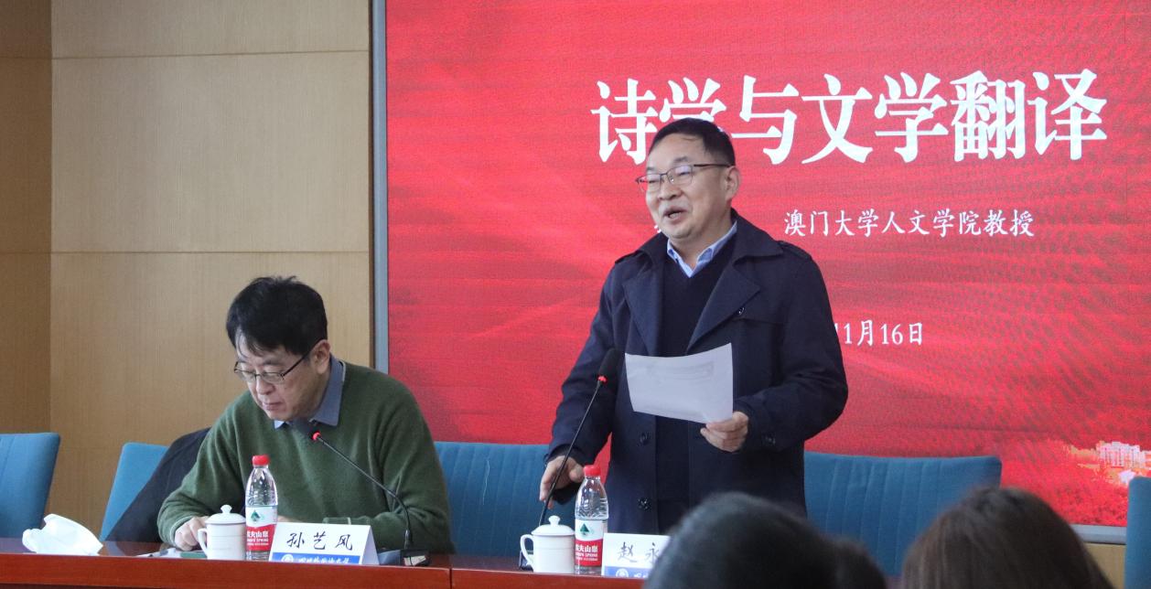 2023年11月16日上午,在西区立德楼C517会议室,澳门大学人文学院翻译学讲座教授、国际译联期刊Babel: International Journal of Translation主编孙艺风教授做客我院歌乐译(Glory)讲坛,为广大师生带来了以“Poetics and Literary Translation”为题的讲座,本场讲座由学校英语学院院长赵永峰教授主持。