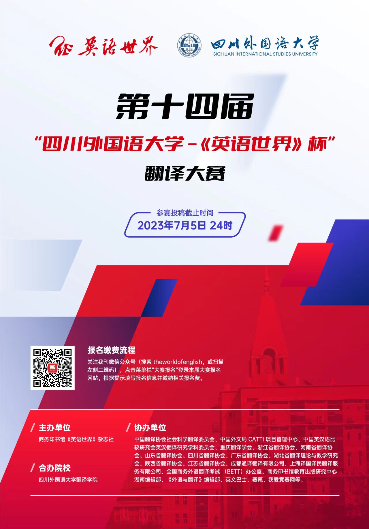 第十四届“《英语世界》杯”翻译大赛得到四川外国语大学的大力支持,并由该校冠名本届比赛。2023年的翻译大赛包含“英译汉”和“汉译英”两个组别。大赛初评由合办院校及《英语世界》编辑部负责;复评和终评将延续历届传统,从全国各地邀请知名翻译专家进行评审,以确保大赛评审的权威性和公信力。
