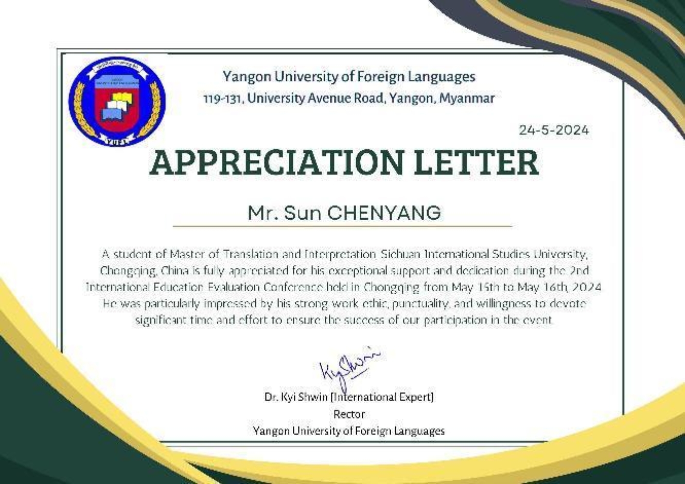 缅甸联合国教科文全国委员会秘书长、缅甸仰光外国语大学校长季师伟(Kyi Shwin)先生致我院学子孙晨阳的感谢信