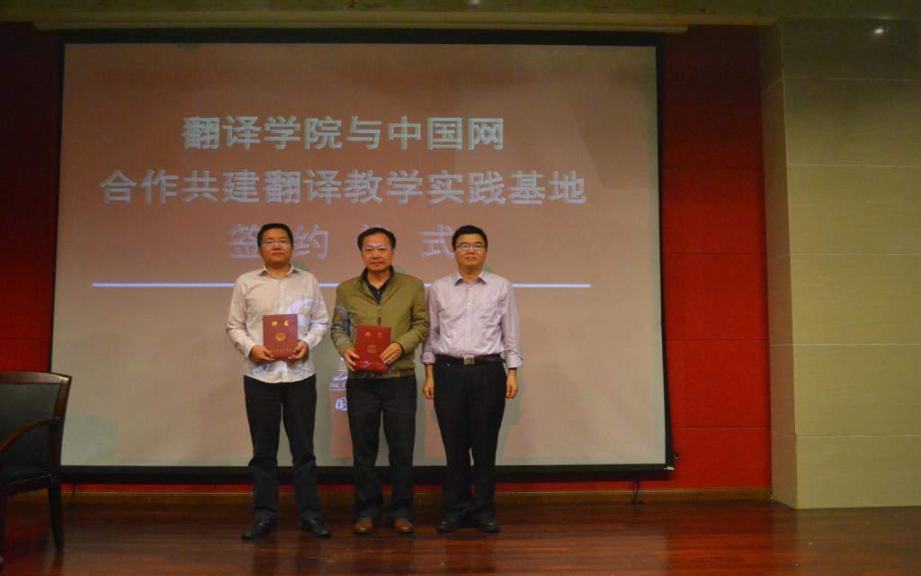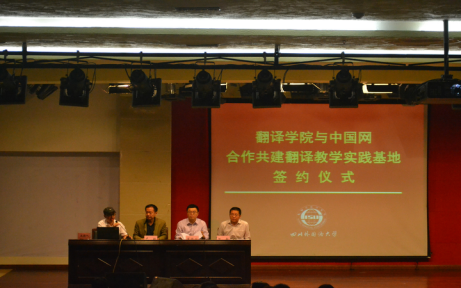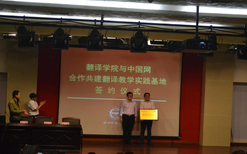 为了给川外学子提供更好的实训机会和更高的实践教学平台,太阳成集团tyc33455,太阳成集团官方网站与中国网进行了多次洽谈并开展了多项前期合作项目,最终两家成功达成合作意向。胡安江在仪式开始前简要介绍了双方的合作背景,并希望此次的签约与授牌仪式是两家单位成功合作的新起点。中国网英文部主任陈超是川外98级研究生校友,他为在座师生详细介绍了中国网的相关情况以及中国网英文部在翻译方面开展的各项工作。他欢迎同学们加入中国网,并承诺将为川外师生提供各种翻译实践的机会,切实提升川外学生的翻译实践能力。随后,董洪川与陈超正式签署合作协议,双方举行了隆重的授牌与接牌仪式。中国网正式成为我校翻译教学实践的重要基地。