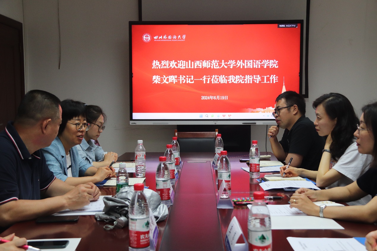 6月19日上午,山西师范大学外国语学院党委书记柴文晖、副院长黄远鹏、日语系副主任张秀娟博士、学院辅导员兼本科生第一党支部书记刘丽老师一行四人莅临我院调研交流。交流会在西区立德楼楼B109会议室进行。学院总支书记张丽、日语学院院长助理赵晓燕、辅导员兼本科学生支部书记王品老师、教学秘书李亮老师参加了交流座谈。