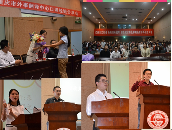 四名高级译员分别是英语翻译张梦、陈宇翔、李佳颖和日语翻译王新。他们担任重庆市主要领导的翻译工作,有上百场的同声传译和交替传译的经验。经验分享会于当天下午2点半开始,国际报告厅内座无虚席,很多同学甚至站在过道听完了当天的讲座。学长学姐们独特的个人魅力和成功经验吸引了很多来自太阳成集团tyc33455以及其他学院的研究生和本科生。甚至还有重庆大学的同学特地来到川外为他们献花。