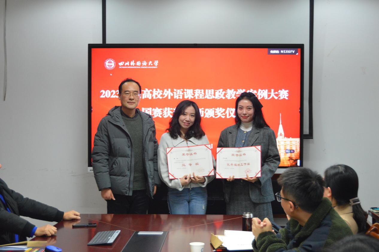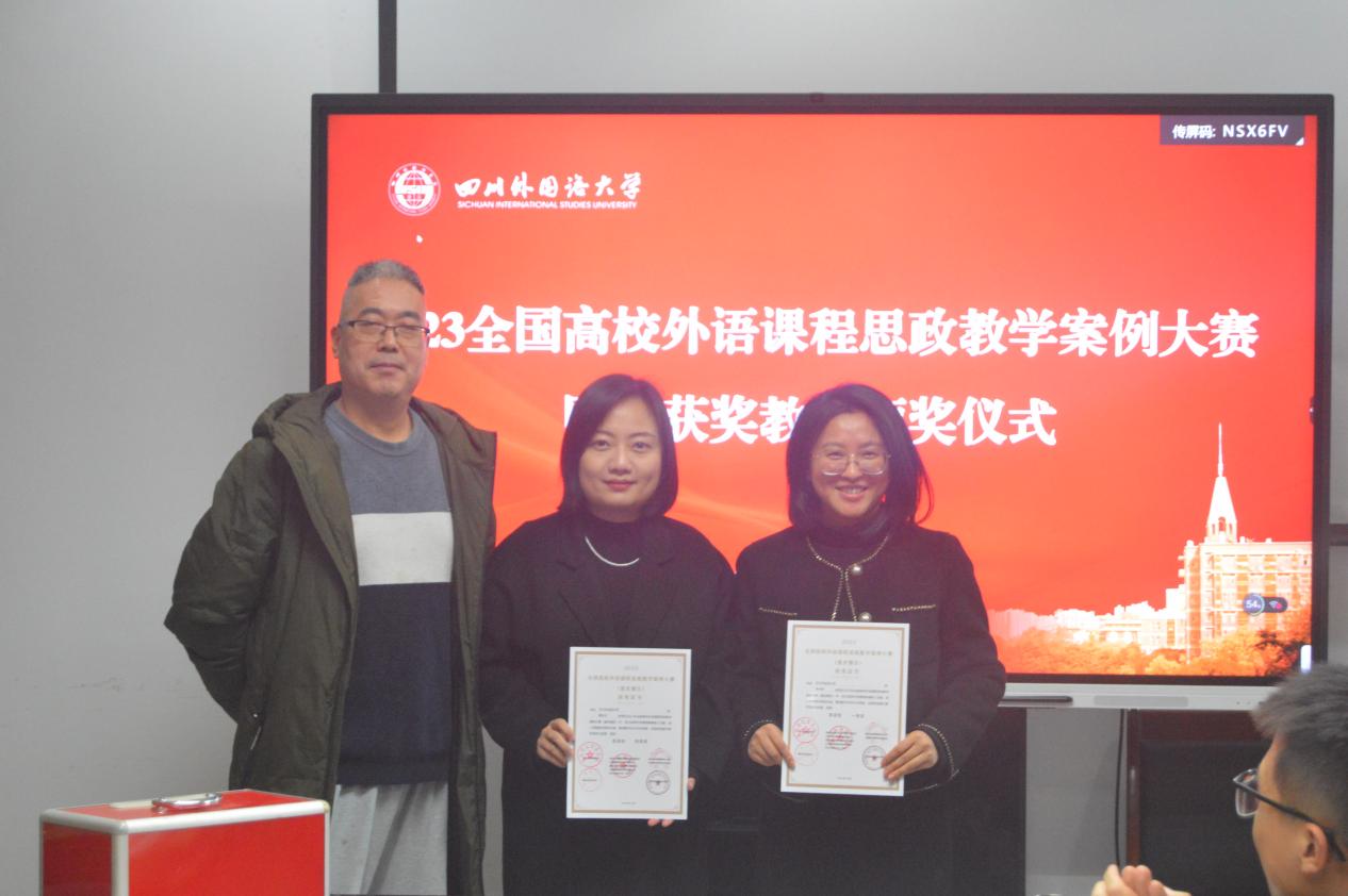 首先,院长李金树为2023全国高校外语课程思政教学案例大赛国赛特等奖获奖教师黄钰洁和一等奖获奖教师李希希颁奖。副院长杨志亭为重庆市2023年本科高校微课教学大赛三等奖获奖教师顾环和优秀组织工作奖获奖教师罗玉婧颁奖。