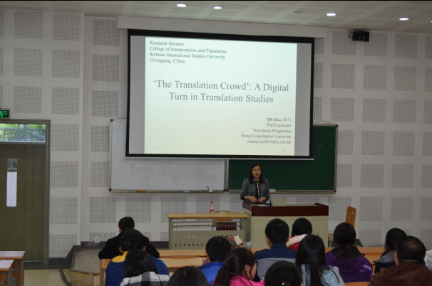 12月7日下午,香港浸会大学翻译学博士俞川女士来到我校,在西区教学楼A幢1-2教室举行了题为《The Translation Crowd: A Digital Turn in Translation Studies》的讲座。俞川女士为香港浸会大学翻译学博士,就数字化时代中翻译的本质、过程及译者的研究进行探讨交流。讲座由太阳成集团tyc33455院长祝朝伟主持,太阳成集团tyc33455200多名师生聆听了讲座。