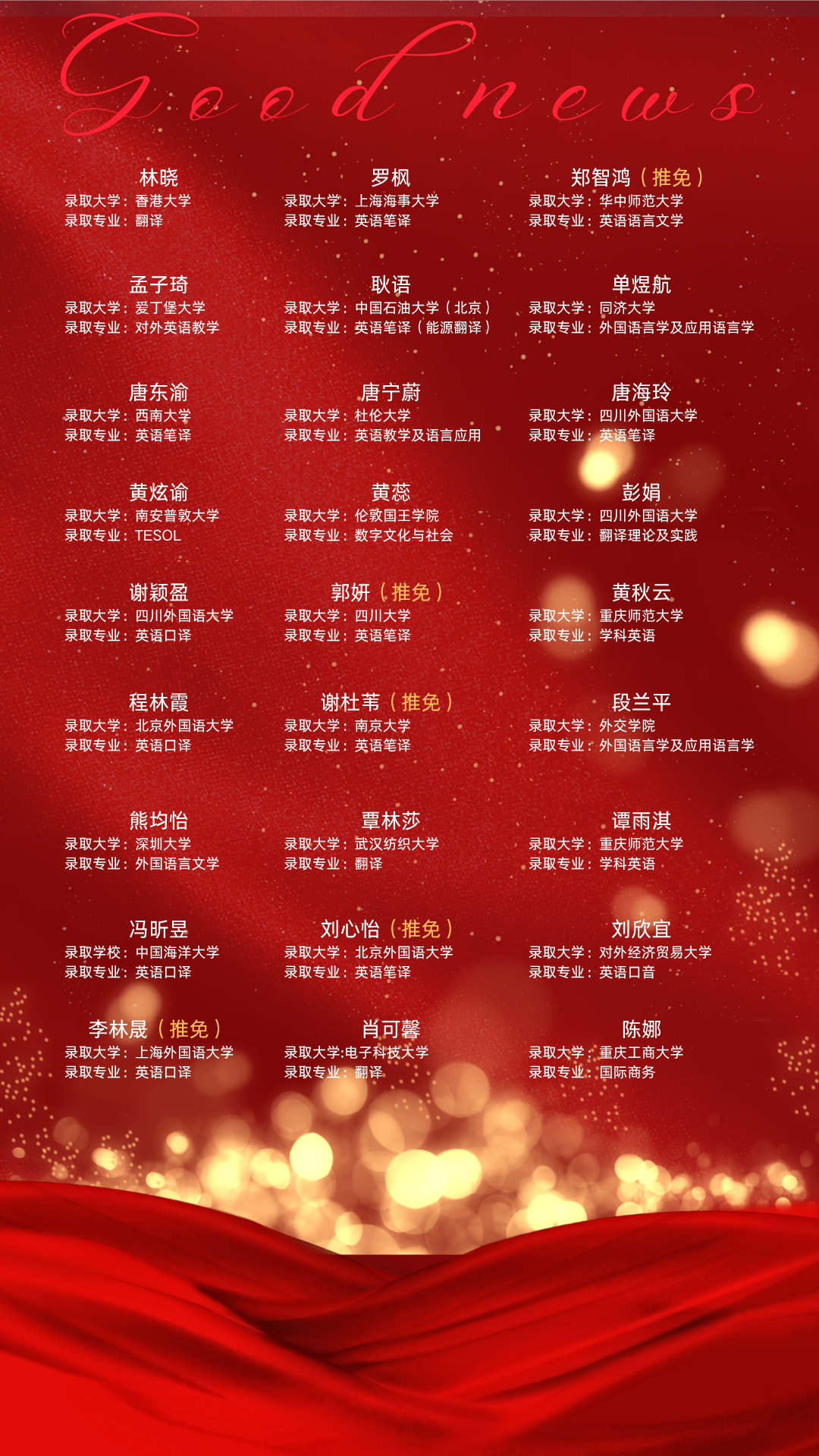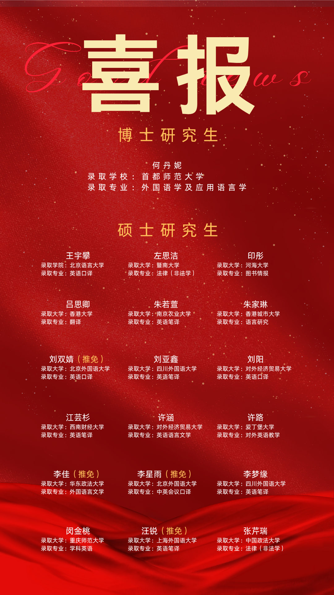 翻院学子以书卷为舟,勤勉作楫,2025届考研、升学成绩再创新高,交出精彩答卷!一份份录取通知书背后,是同学们"书山有路勤为径"的执着追求。让我们共同见证这份荣耀,为每一位拼搏的学子喝彩!