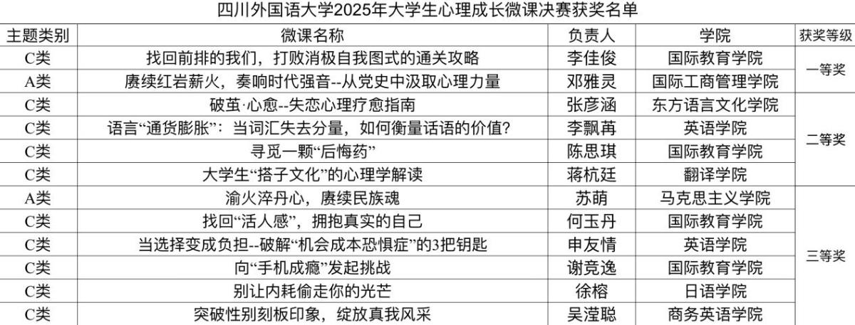 至此,四川外国语大学2025年大学生心理成长微课比赛圆满结束。本次心理成长微课比赛的举办不仅为广大学生提供了一个展示自我、交流学习的平台,更有效地普及与推广了心理健康知识,营造了关注心理健康、重视心理成长的良好氛围。相信此次活动定能助力我校心理健康教育工作的蓬勃发展,用专业与温情守护同学们的心灵成长之路。