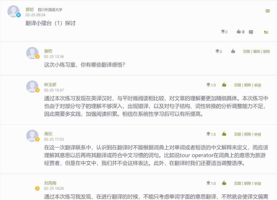 谈到这次线上教学,唐昉老师说到:“这次教学模式的转变让我深深感到线上教学不是课堂教学的网上直播,更需要教师从知识的提供者转变为学生学习的指导者,可充分利用已有优质慕课资源,实现多样化优质教学资源与学生个性化学习结合。比如针对《英汉笔译》课程,我给不同学习需求的同学分别推荐线上拓展学习资源:希望系统学习的同学浏览《翻译有“道”》慕课;偏爱影视歌曲翻译的同学加入《趣味英语与翻译》慕课;想要参加翻译资格考试的同学在《CATTI翻译资格考试笔译备考基础》慕课平台强化训练。课堂上,我则主要通过学习通+QQ群结合的模式,开展签到、音视频播放、讨论、答疑、测验等活动。虽然无法面对面讲授,但每一次的提问反馈,每一次的互动讨论,都能感觉到同学们的积极投入与专注。”