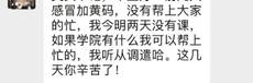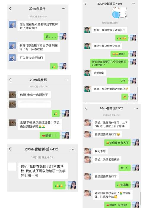 初秋的山城,气温骤降,让不少打算周末回家的同学措手不及,得知学弟学妹们没有厚棉被后,在校外实习的同学纷纷告诉辅导员:“老师,我有,去寝室拿吧.....”