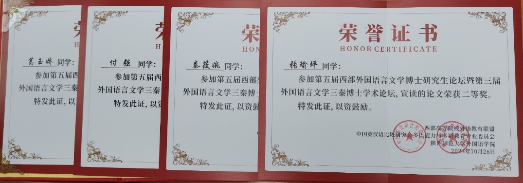 设置了外国文学研究、语言学研究、翻译与翻译学研究以及文化与文化对比研究四个分论坛。我院4名学子均表示,通过本次论坛交流,对外国文学、语言学、翻译以及文化对比研究都有了更全面的认识。这些领域不仅相互关联,还共同构成了跨学科理解和交流的基础。希望未来能在这些领域继续深入探索,促进更广泛的学术交流与合作。此外,在论文评奖环节,葛玉娇与张瑜坪荣获二等奖,付强荣获三等奖,秦筱婉荣获优秀奖。