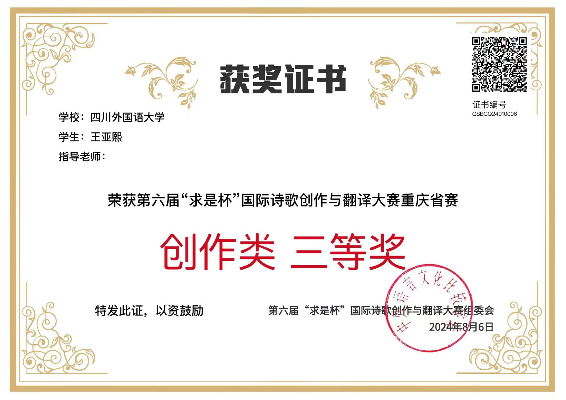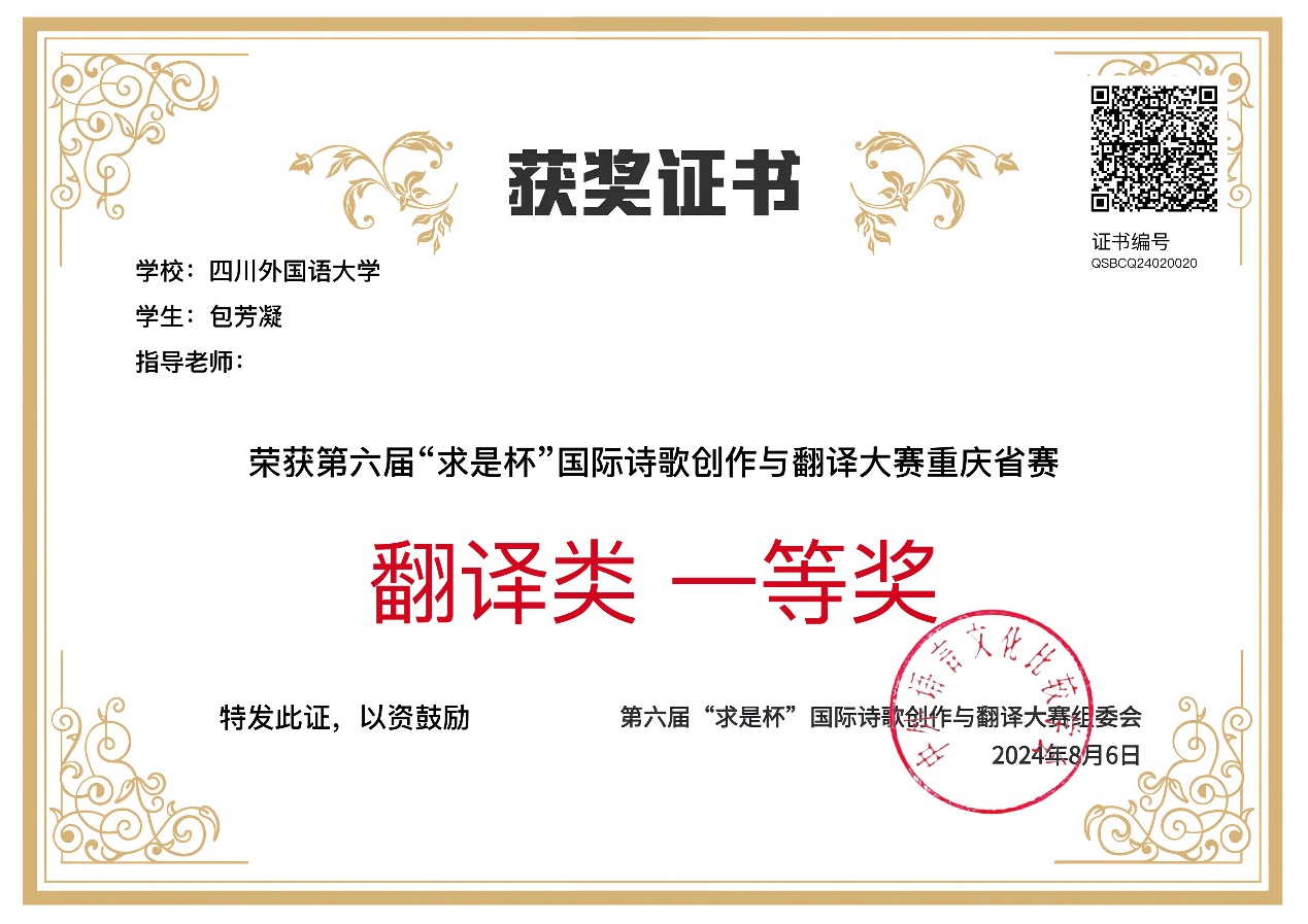 2024年7月25日,第六届“求是杯”国际诗歌创作与翻译大赛省赛评审结果公布。我院学生在比赛中表现突出,喜获佳绩。2023级研究生包芳凝获得重庆市赛翻译类一等奖,2023级研究生文兰兰、2022级本科生王亚熙获得重庆省赛创作类三等奖。