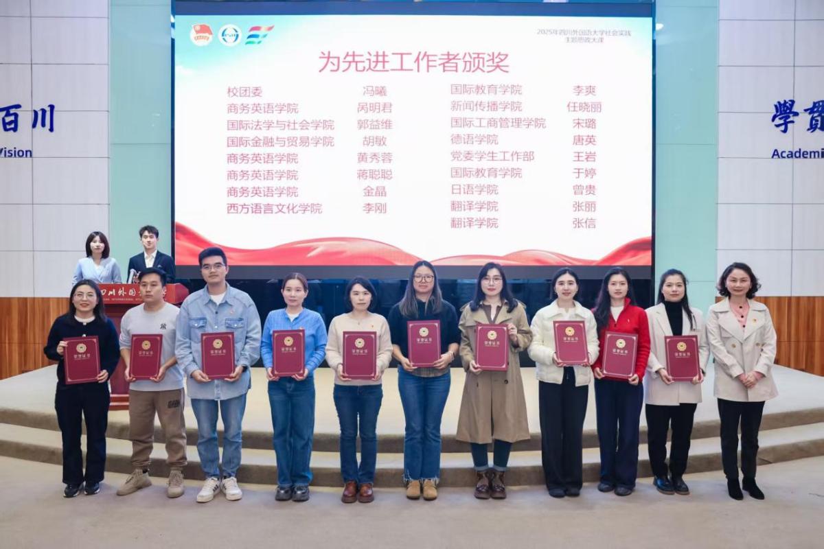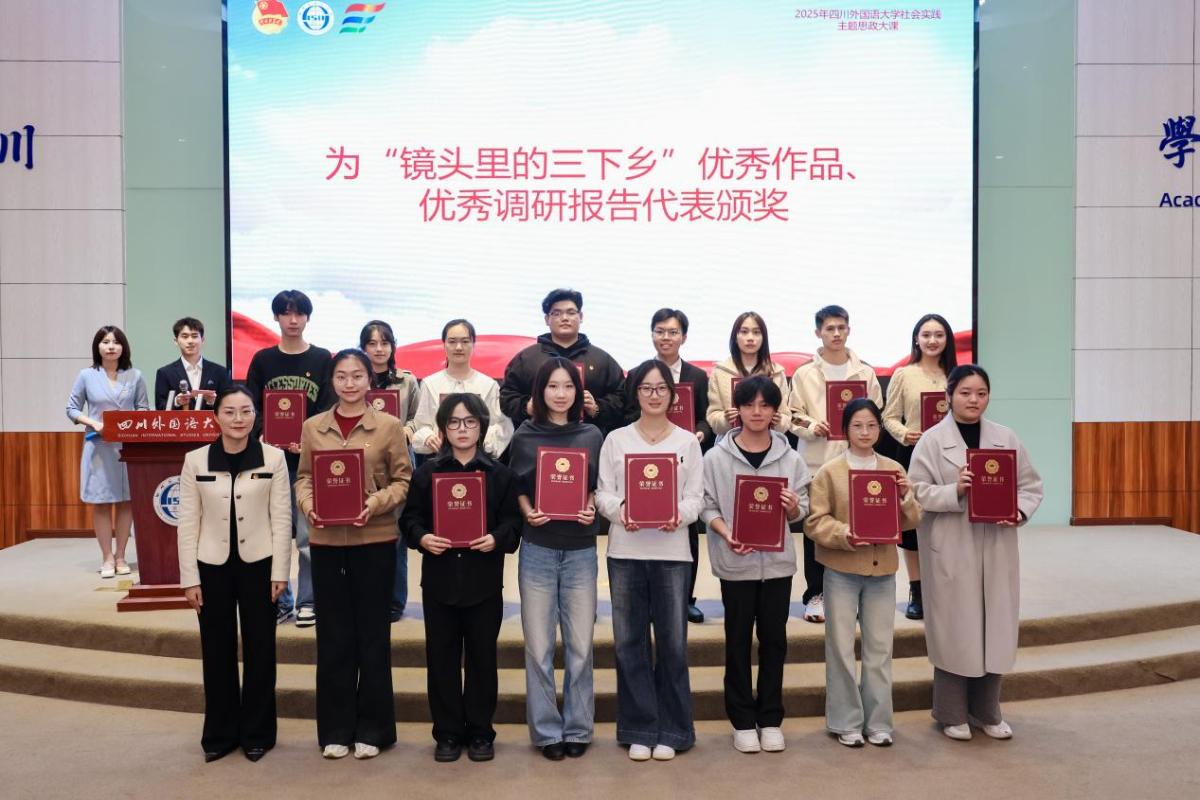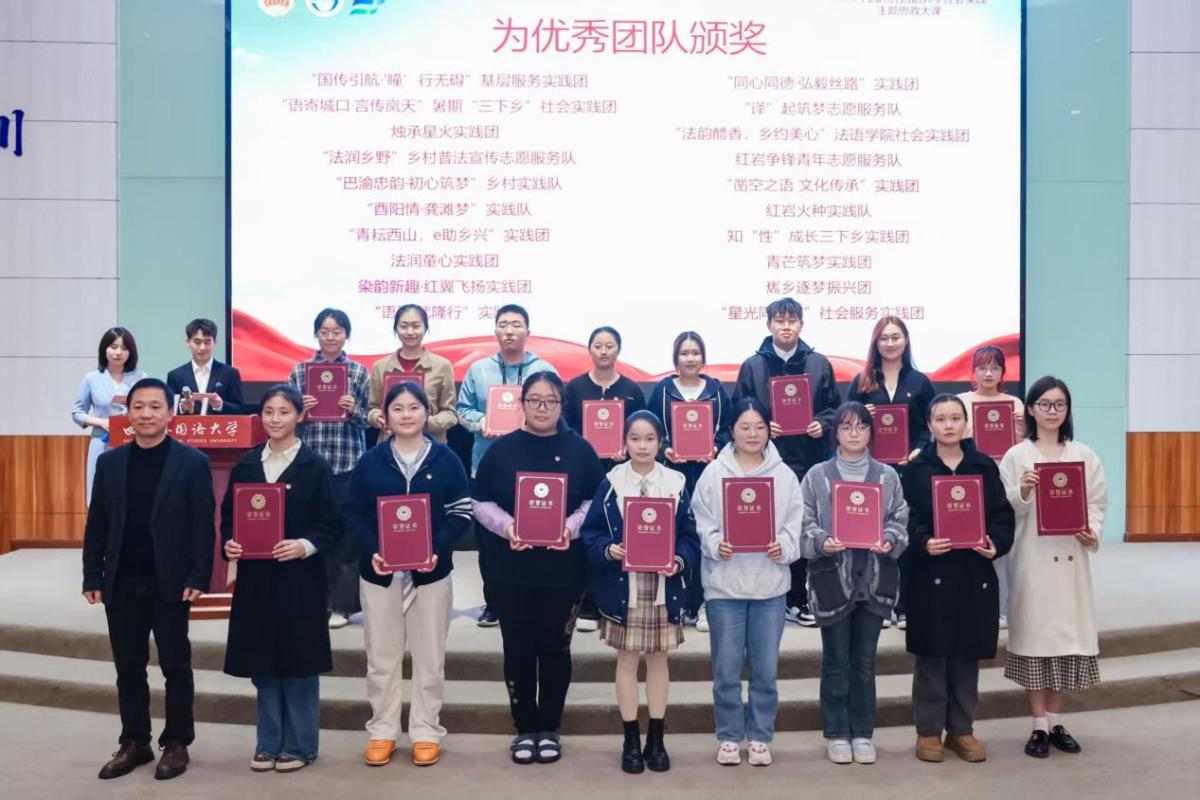 2025年11月4日,四川外国语大学2025年暑期“三下乡”社会实践活动表彰大会在东区宏文楼国际报告厅举行,我院“译”起筑梦志愿服务队表现突出,荣获“优秀团队”“先进工作者”“先进个人”等多项荣誉。