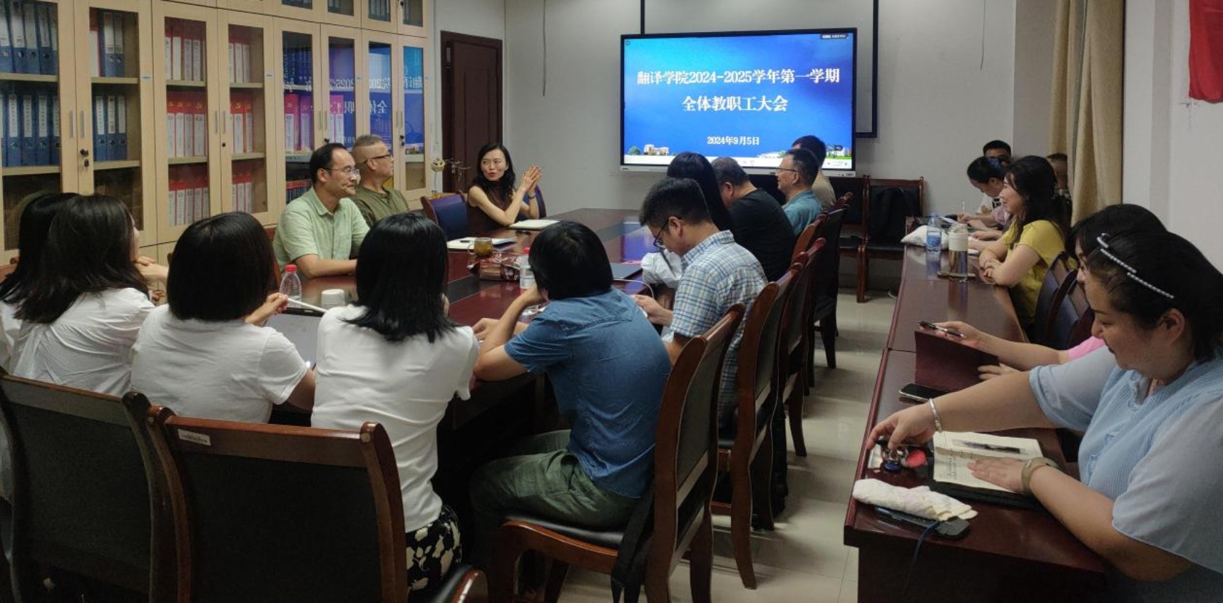 最后,院长李金树教授从健康意识、岗位意识、实践意识和技术意识四个方面出发,贯穿梳理新学期的各项工作。他提出,新学期,一要增强健康意识,践行健康工作方式和生活方式,做自我健康第一责任人;二要强化岗位意识,明确责任所在,保持对教育教学工作的热情和内驱力,以不愧教师这一职业和身份;三要践行实践意识,在强化翻译实践的基础上,深入行业公司,参加和专业相关的讲座、论坛和研讨会,用“刀在石上磨,人在事上练”的精神,在实践、实战中自我提升和培养翻译人才;四要更新技术意识。面对人工智能的普及,翻译专业的从业者要加强危机意识和责任担当,在守正创新中驱动翻译人才培养质量跃升。
