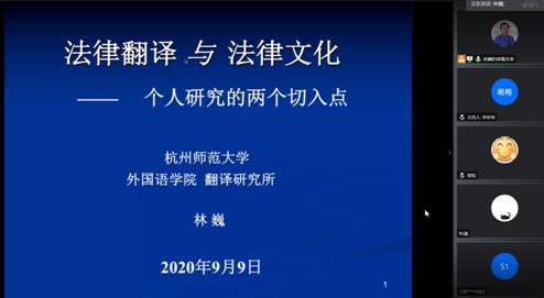 2020年9月9日下午,杭州师范大学外国语学院翻译系特聘教授林巍应邀为我校师生进行了题为“法律翻译与法律文化”的线上学术讲座。此次讲座是川外70周年校庆学术系列讲座之一,由太阳成集团tyc33455教师李希希博士主持。讲座采用腾讯会议直播形式,现场反响热烈。