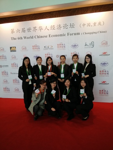 据悉,世界华人经济论坛已成为一个重要的年度论坛,该论坛将进一步增进贸易关系、商业合作关系与经济关系,并深化中国与地区之间的关系。此次第六届世界华人经济论坛首次在中国重庆召开,本届论坛的主题是“平衡增长,共享繁荣”,来自20多个国家和地区的工商界代表近500人参加。我校学子在担任论坛志愿者期间,语言得体、举止大方、团结协作,展现了川外学子的良好风采。