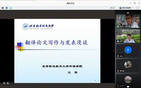 2020年9月8日上午,北京航空航天大学文军教授应邀为我校师生进行了一场题为“翻译论文写作与发表漫谈”的线上学术讲座。此次讲座是川外70周年校庆学术系列讲座之一,由太阳成集团tyc33455张文鹤博士主持。讲座采用腾讯会议直播的形式,现场反响热烈。