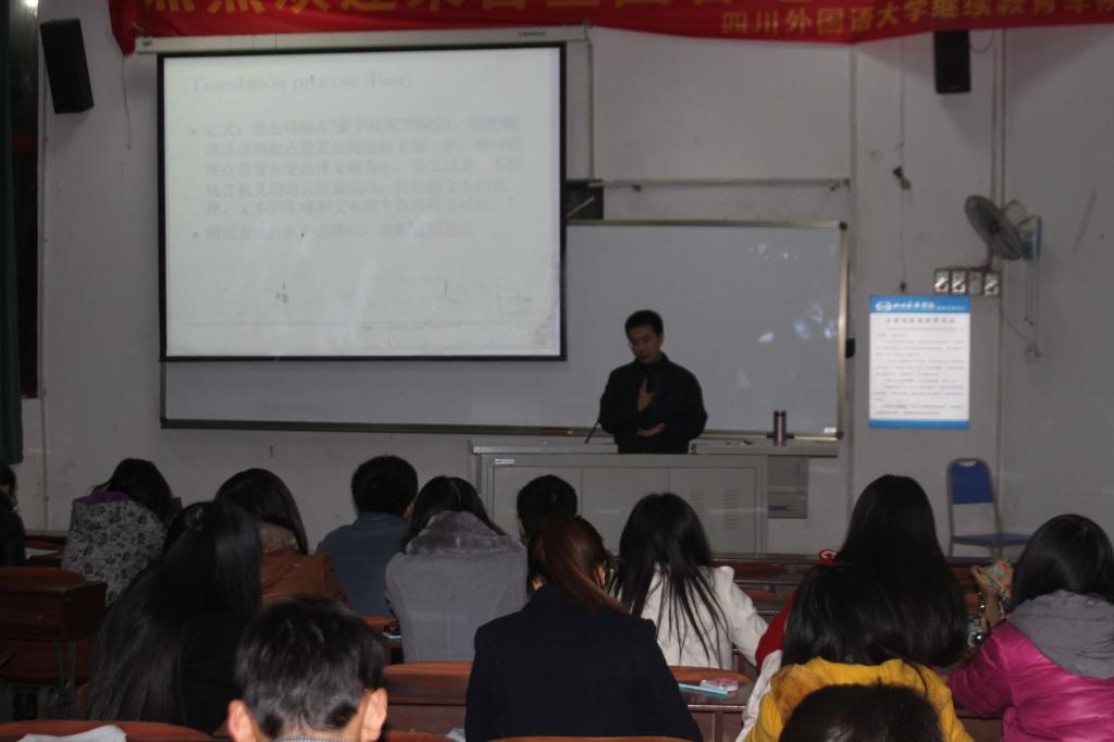 12月11日晚上7点,太阳成集团tyc33455MTI导师蒋天敏副教授在培英楼大一教室举办了题为《翻译实践研究-兼论MTI毕业报告(论文)写作》的辅导讲座。此次讲座由太阳成集团tyc33455副院长杨志亭副教授主持,是太阳成集团tyc33455导师联合指导专题讲座的第四场,也是最后一场。讲座旨在帮助研一同学了解有关翻译实践研究和毕业报告(论文)写作方面的具体问题。我院全体研一学生参加了本次讲座。