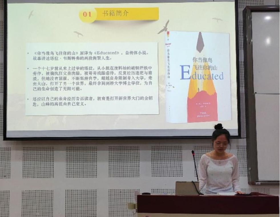 3班杨文焕同学为我们分享《你当像鸟飞往你的山》。 在书里,塔拉用平淡的文字,勇敢地挖掘隐藏在内心深处的伤痛,她通过自身努力克服重重困难,逃离近乎极端的家庭,形成了独立的自我意识和价值观念,像鸟儿一般飞往属于自己的山峰。