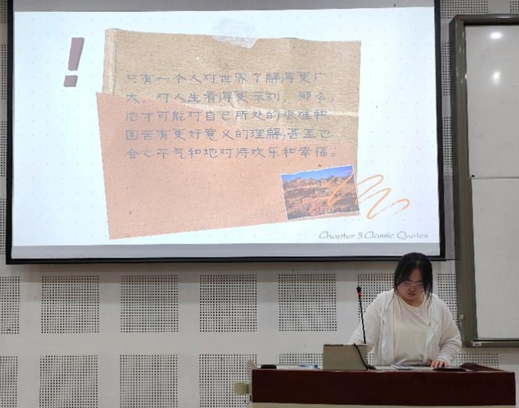 “那最好的世界,就是平凡的世界。”1班武诗蓉同学与我们分享了《平凡的世界》。在中国广袤的土地上,勤劳质朴的庄稼人所经受的冲击和转变在文化大革命前后尤为深刻。少平进城闯荡寸步难行,晓霞的不辞而别,少安办砖厂的兴衰起落,都是再普通不过的人的真实写照。无论我们承认与否,这就是生活原本的样子。《平凡的世界》里平凡的人,向我们展示了非凡的一面,是一部年轻人的奋斗史。