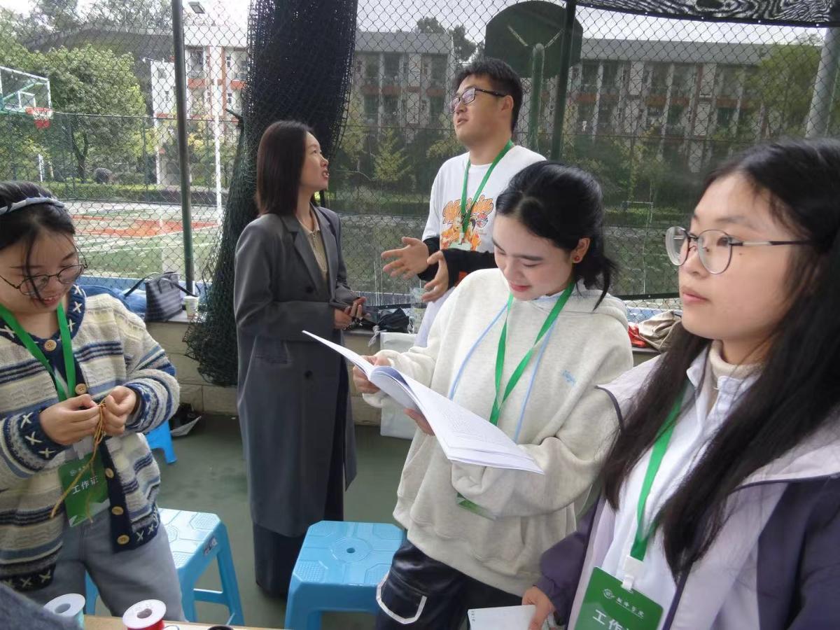 其次是“结缘四海”——巧手编中国结体验区。这是整个展位最富诗意的角落。翻译协会的成员们化身“文化使者”,耐心教导过往的同学编织简易的中国结。一根根红绳在指尖穿梭缠绕,寓意着吉祥、团结。协会会长赵新雷解释道:“‘结’在中国文化中代表联结与美好。我们希望通过这个活动,让大家亲手‘编织’一份对中国传统文化的理解,这也是我们身为语言学习者,投身中西文化交流、推动文明互鉴的初心与使命。。”
